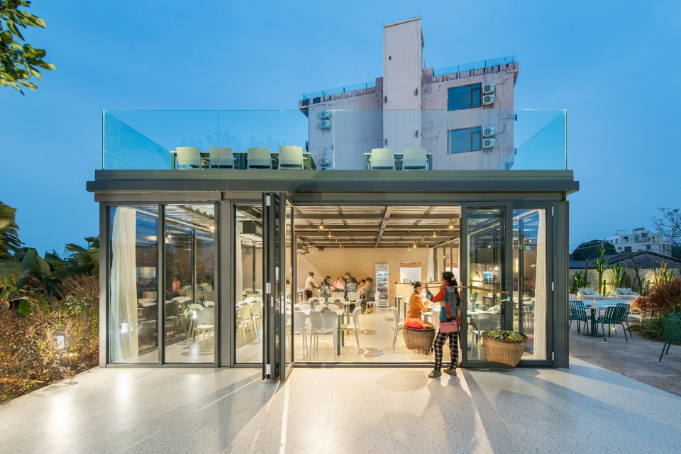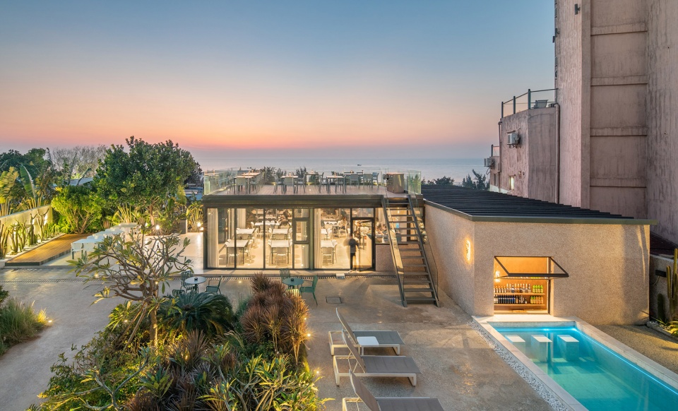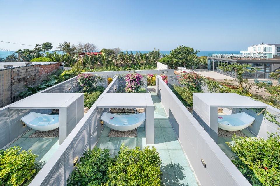 在景觀處理上,民宿設計公司利用金屬孔板圍墻與爬藤植物打造私密性與自然共生的圍墻。餐廳位于基地邊界靠海的位置,是個通透的玻璃建筑,與室外景觀融合一起。用餐者在玻璃房能享受院子的景觀,屋頂能看到一望無際的海景。