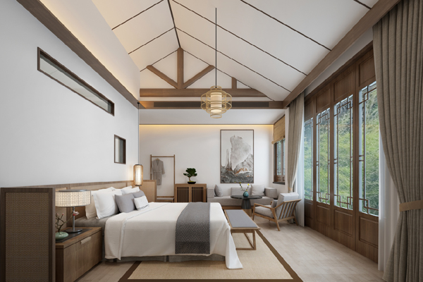 民宿在裝修上講究空間的層次感,在需要隔絕視線的地方,則使用中式的屏風(fēng)或窗欞、中式木門、工藝隔斷、簡約化的中式“博古架”,通過這種新的分隔方式,單元式住宅就展現(xiàn)出中式家居的層次之美。再以一些簡約的造型為基礎(chǔ),添加了中式元素,使整體空間感覺更加豐富,大而不空、厚而不重,有格調(diào)又不顯壓抑。
